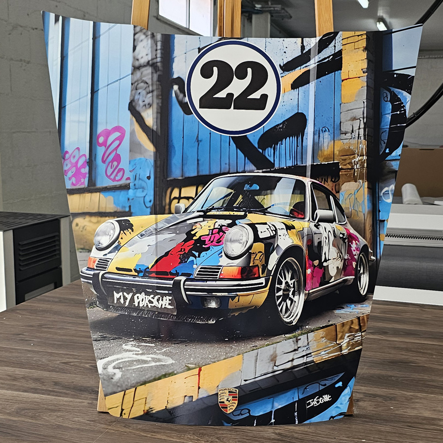 L’impression directe sur l’aluminium est protégé par un pelliculage haut de gamme brillant , donnant l’impression d’un vernis de carrosserie.