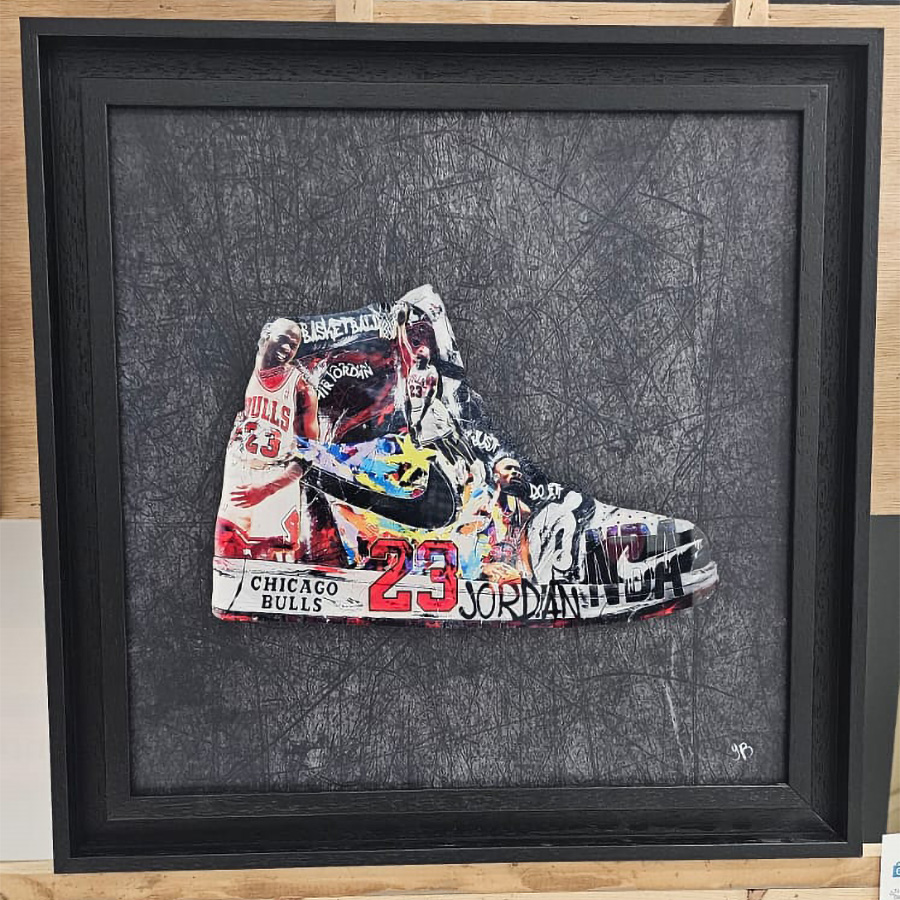 Le plexi est accroché à un PVC imprimé, le tout encadré par un cadre noir.