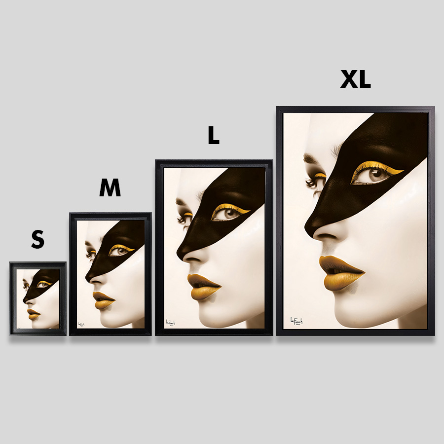 Vendu avec cadre uniquement, aux dimensions suivantes : 32 x 42 cm, 50 x 70 cm, 70 x 100 cm et 90 x 130 cm.